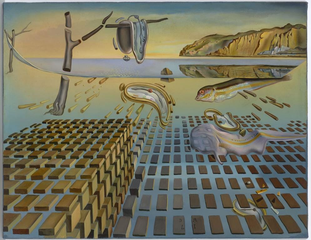 The two paintings above — The Persistence of Memory (1931) and The Disintegration of the Persistence of Memory (1958) — are Salvador Dalí’s most haunting meditations on time. Twenty‑seven years apart, they reveal a truth we ignore at our peril: memory is fragile, ever‑fading, and always in danger of dissolution. Dalí sensed that the world he painted in 1931 had already begun to liquefy by 1958. Were he alive today, one wonders what a third update might reveal.